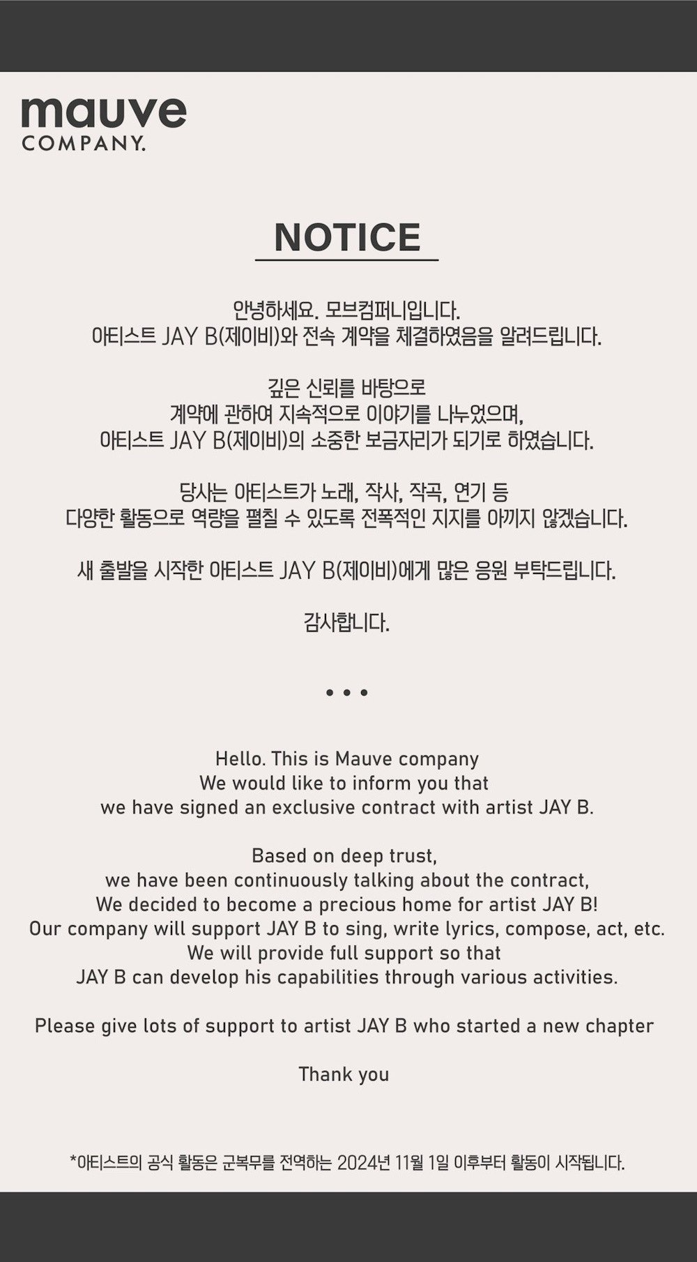 Depois de se separar da CDNZA Records em julho passado, Jay B assinou agora um contrato exclusivo com a Mauve Company, que também abriga Junny . Em 6 de outubro, a gravadora anunciou a notícia, afirmando: “Decidimos nos tornar um lar precioso para o artista Jay B! Nossa empresa apoiará Jay B para cantar, escrever letras, compor, atuar, etc.”,