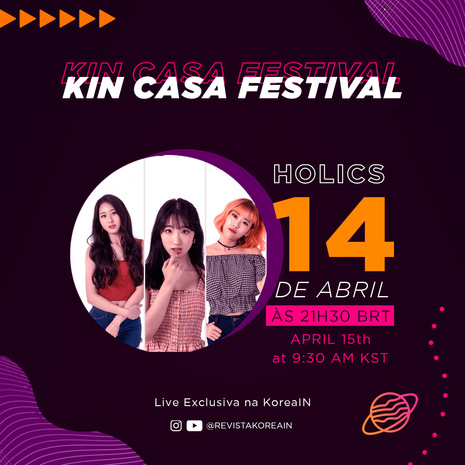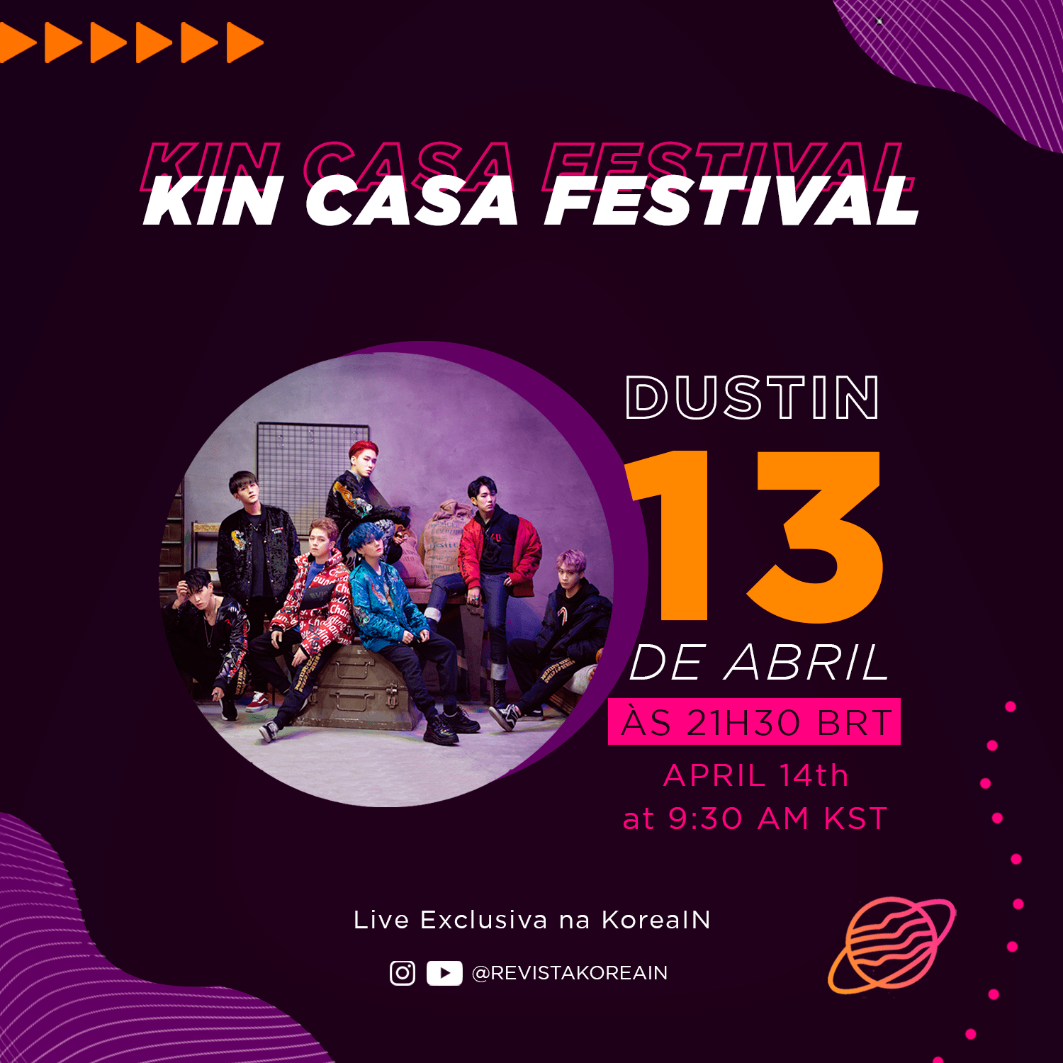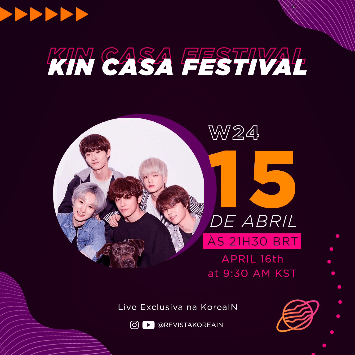 A partir do dia 13 de abril, o site sobre cultura sul-coreana KoreaIN, receberá em sua programação o KIN Casa Festival, com: shows singulares, acessíveis, confortáveis e – acima de tudo – seguros. A iniciativa conta com todo o entretenimento gratuito, através de lives musicais simultâneas no Instagram e YouTube do portal. A KoreaIN oferece diversão em casa para os fãs de KPOP e os grupos W24, Holics e DUSTIN são presença confirmada durante a primeira semana do evento. As apresentações têm início no dia 13 de Abril ás 21h30.