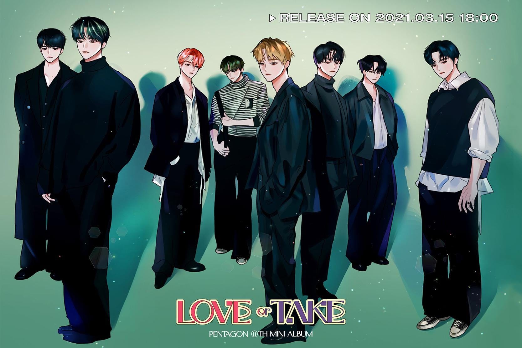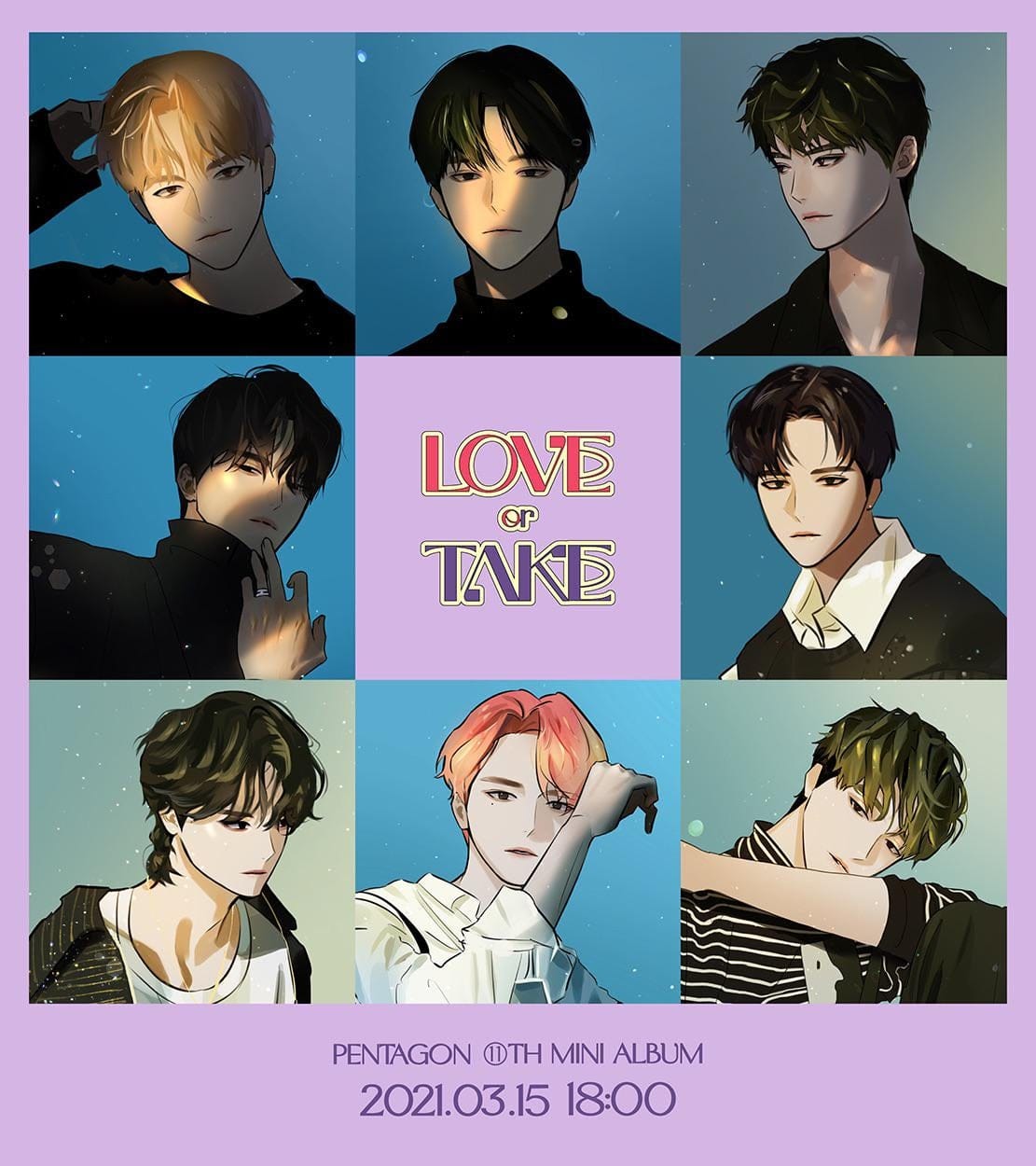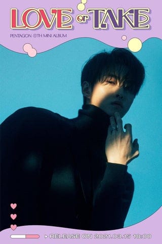 Nas novas imagens teasers , os personagens do webtoon do Pentagon assumem um conceito chique, diferente das imagens anteriores, onde os rapazes estavam vestidos com roupas esportivas em uma quadra de tênis. O 11º mini-álbum do grupo “Love or Take” está programado para ser lançado em 15 de março KST.